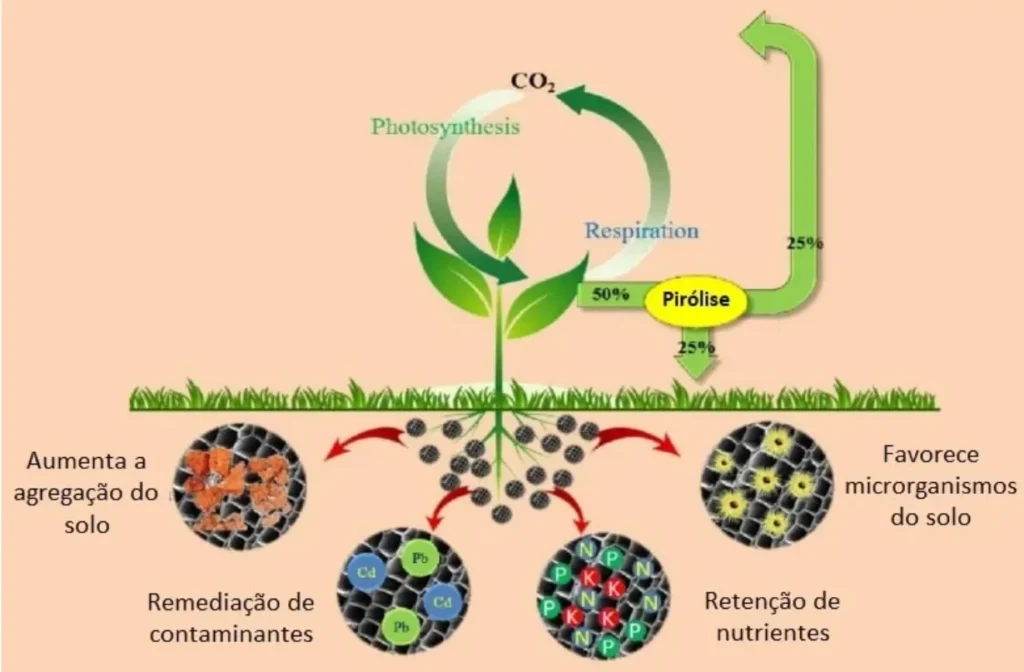 Se a biomassa fosse queimada ou apodrecesse naturalmente no ambiente, o C seria liberado para o ambiente na forma de CO2. Com a pirólise o C permanece no biochar e é devolvido ao ambiente. Na produção do biochar ocorre justamente o oposto, o carbono fica retido no material orgânico e é devolvido ao solo.
