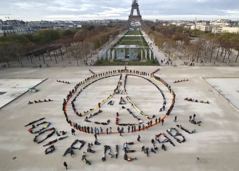 Manifestantes protestam por energias “100% renováveis” numa praça próximo a Torre Eiffel durante a COP 21, que estabeleceu o Acordo de Paris. — Foto: AP PhotoMichel Euler, File
